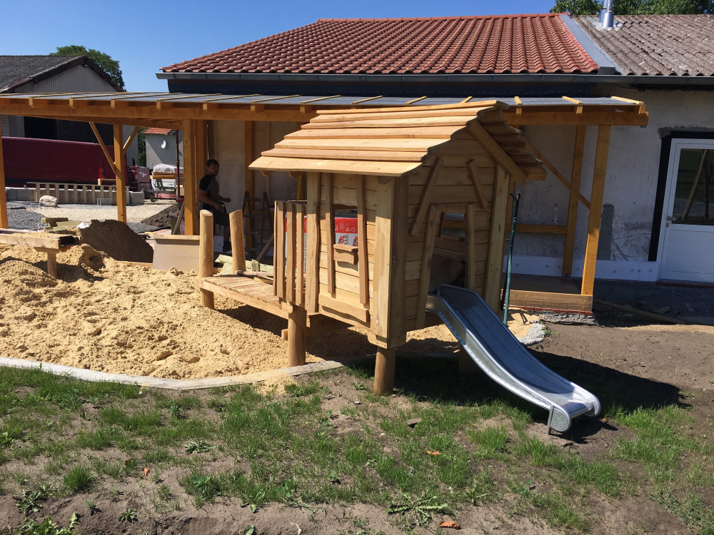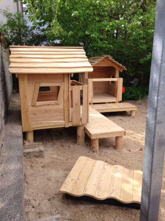 Die Brücke/der Steg sorgt für Bewegung und Abwechslung: raufgehen, rüberlaufen, wieder zurück – das fördert ganz nebenbei Balance, Koordination und Körperspannung. Gleichzeitig ist das Häuschen ein toller Treffpunkt, an dem mehrere Kinder gemeinsam spielen können, ohne dass es langweilig wird: einer „wohnt“ drin, der nächste steht am Fenster, andere kommen über die Brücke dazu.